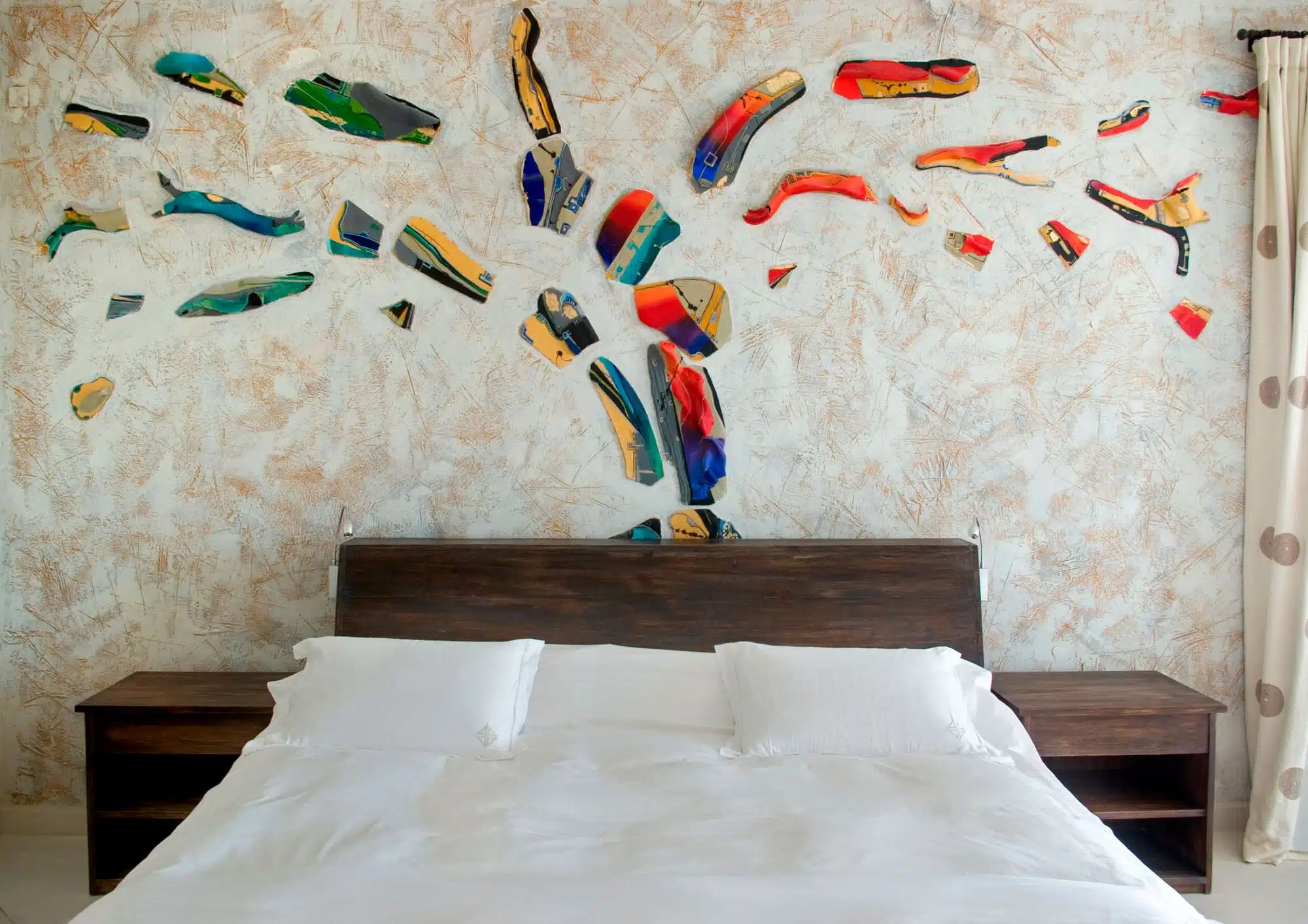 Voices of a voyage ~ Painting on canvas ~ Volumetric mural, wood and polychrome ceramics ~ Tree trunk, texts on wall "Voices of a journey" Enrique Badaro seeks to deepen one of the topics that has haunted him in his life: movements and cultural transformations of the people in America. The intention was to delve into a particular view on the first approach of human beings in the lands of South and Central America.